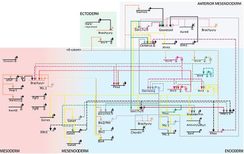 The process of germ layer specification in Xenopus laevis has been extensively studied and a detailed picture describing the underlying genetic regulatory events is emerging. In part, this is a result of our work to deduce a GRN describing the specification of mesoderm and endoderm during early development ( Loose and Patient, 2004). This network, although incomplete as not all interactions have yet been experimentally verified, already appears highly complex (see below).