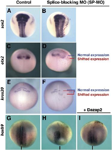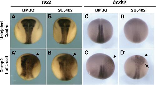 Dazap2 is required for FGF-mediated posterior neural patterning, independent of Wnt and Cdx function. , Roche DD, Liu KJ , Harland RM , Monsoro-Burq AH ., Dev Biol. September 1, 2009; 333 (1): 26-36.