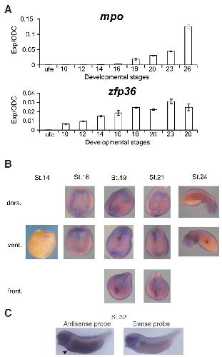 zfp36 expression delineates both myeloid cells and cells localized to the fusing neural folds in Xenopus tropicalis. , Noiret M , Hardy S , Audic Y ., Int J Dev Biol. January 1, 2014; 58 (10-12): 751-5.