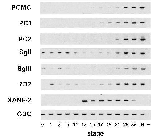 Differential onset of expression of mRNAs encoding proopiomelanocortin, prohormone convertases 1 and 2, and granin family members during Xenopus laevis development. , Holling TM, van Herp F, Durston AJ , Martens GJ., Brain Res Mol Brain Res. January 10, 2000; 75 (1): 70-5.