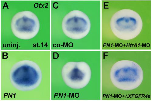 The secreted serine protease xHtrA1 stimulates long-range FGF signaling in the early Xenopus embryo. , Hou S, Maccarana M, Min TH, Strate I, Pera EM ., Dev Cell. August 1, 2007; 13 (2): 226-41.