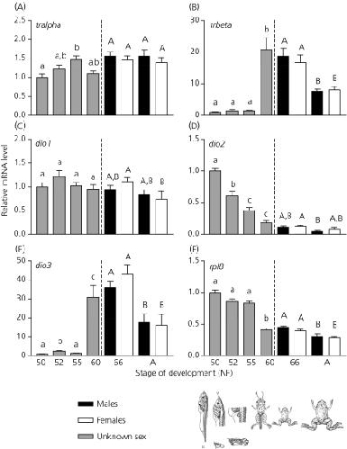 Expression profiles of reproduction- and thyroid hormone-related transcripts in the brains of chemically-induced intersex frogs. , Langlois VS , Duarte-Guterman P, Trudeau VL ., Sex Dev. January 1, 2011; 5 (1): 26-32.