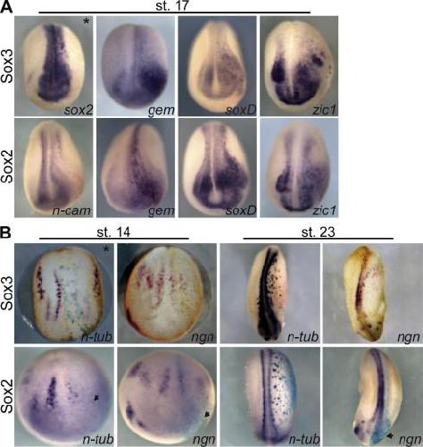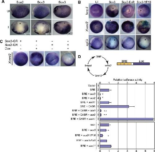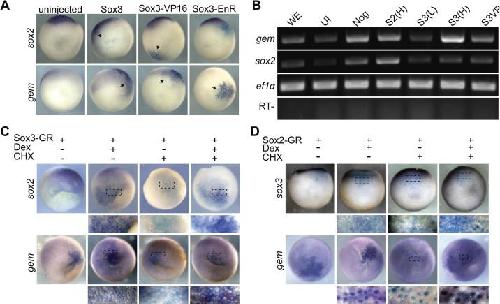 Xenopus Sox3 activates sox2 and geminin and indirectly represses Xvent2 expression to induce neural progenitor formation at the expense of non-neural ectodermal derivatives. , Rogers CD, Harafuji N, Archer T, Cunningham DD , Casey ES ., Mech Dev. January 1, 2009; 126 (1-2): 42-55.