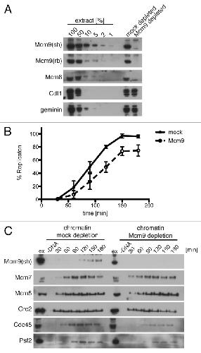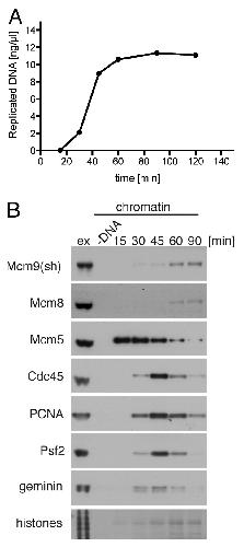Mcm8 and Mcm9 form a dimeric complex in Xenopus laevis egg extract that is not essential for DNA replication initiation. , Gambus A, Blow JJ ., Cell Cycle. April 15, 2013; 12 (8): 1225-32.