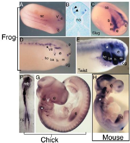 Relationship between gene expression domains of Xsnail, Xslug, and Xtwist and cell movement in the prospective neural crest of Xenopus. , Linker C, Bronner-Fraser M , Mayor R ., Dev Biol. August 15, 2000; 224 (2): 215-25.