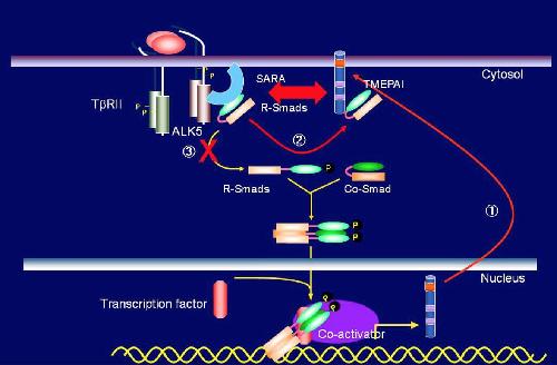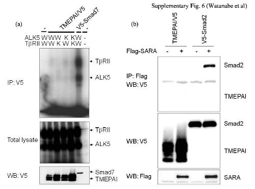 TMEPAI, a transmembrane TGF-beta-inducible protein, sequesters Smad proteins from active participation in TGF-beta signaling. , Watanabe Y, Itoh S, Goto T , Ohnishi E, Inamitsu M, Itoh F, Satoh K, Wiercinska E, Yang W, Shi L, Tanaka A, Nakano N, Mommaas AM, Shibuya H , Ten Dijke P, Kato M., Mol Cell. January 15, 2010; 37 (1): 123-34.