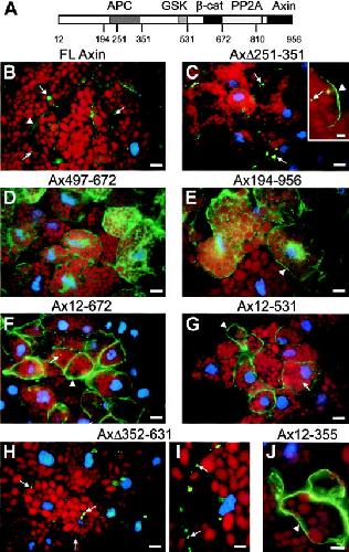 Domains of axin involved in protein-protein interactions, Wnt pathway inhibition, and intracellular localization. , Fagotto F , Jho Eh , Zeng L, Kurth T, Joos T, Kaufmann C, Costantini F., J Cell Biol. May 17, 1999; 145 (4): 741-56.