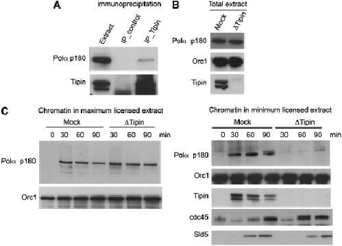 Tipin is required for stalled replication forks to resume DNA replication after removal of aphidicolin in Xenopus egg extracts. , Errico A, Costanzo V, Hunt T ., Proc Natl Acad Sci U S A. September 18, 2007; 104 (38): 14929-34.