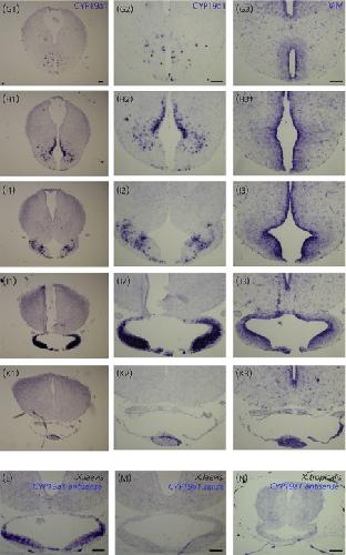 Cyp19a1 ( aromatase) expression in the Xenopus brain at different developmental stages. , Coumailleau P , Kah O., J Neuroendocrinol. April 1, 2014; .