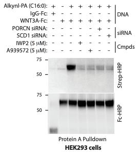 Stereoselective fatty acylation is essential for the release of lipidated WNT proteins from the acyltransferase Porcupine (PORCN)., Tuladhar R, Yarravarapu N, Ma Y, Zhang C, Herbert J, Kim J, Chen C, Lum L., J Biol Chem. April 19, 2019; 294 (16): 6273-6282. |