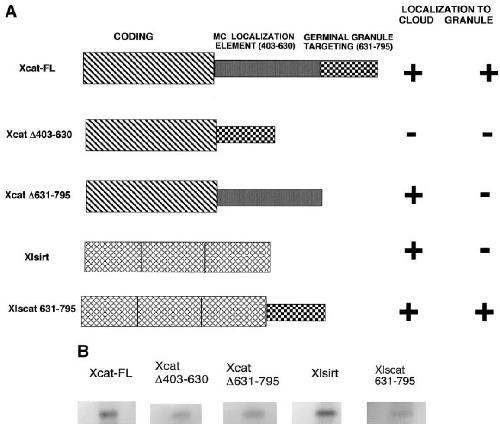 The targeting of Xcat2 mRNA to the germinal granules depends on a cis-acting germinal granule localization element within the 3'UTR. , Kloc M , Bilinski S , Pui-Yee Chan A, Etkin LD ., Dev Biol. January 15, 2000; 217 (2): 221-9.