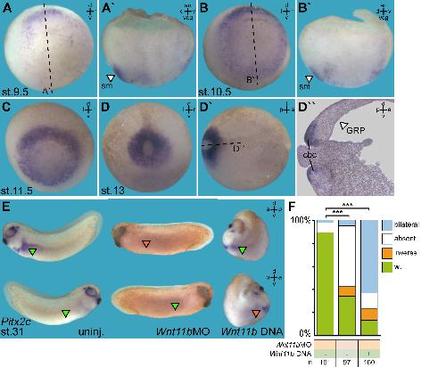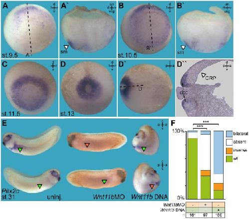 Wnt11b is involved in cilia-mediated symmetry breakage during Xenopus left- right development. , Walentek P , Schneider I, Schweickert A , Blum M ., PLoS One. January 1, 2013; 8 (9): e73646.