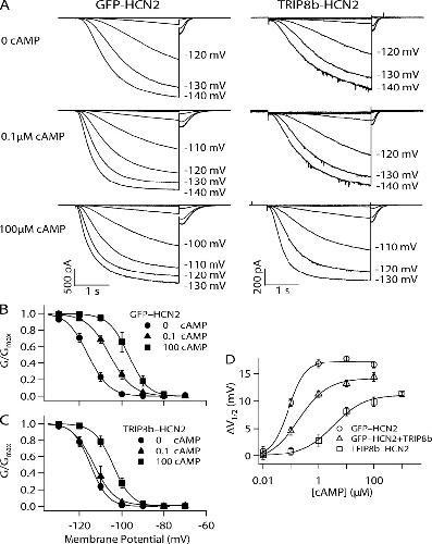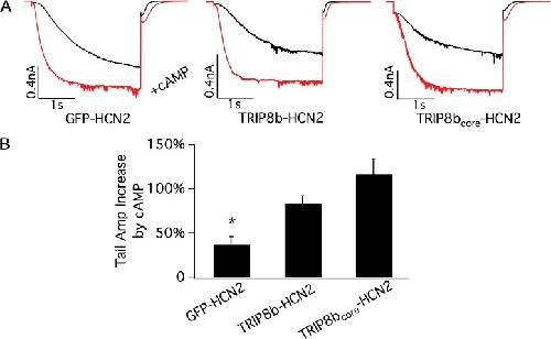 Binding of the auxiliary subunit TRIP8b to HCN channels shifts the mode of action of cAMP. , Hu L, Santoro B, Saponaro A, Liu H , Moroni A, Siegelbaum S., J Gen Physiol. December 1, 2013; 142 (6): 599-612.