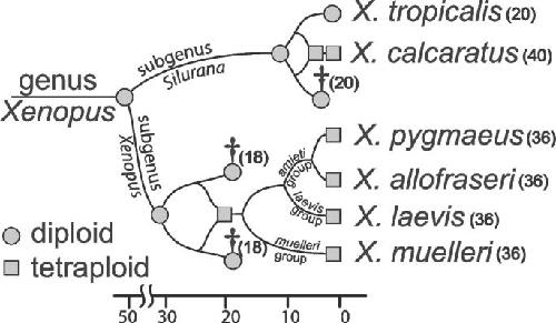 A mitochondrial DNA phylogeny of African clawed frogs: phylogeography and implications for polyploid evolution. , Evans BJ , Kelley DB , Tinsley RC, Melnick DJ, Cannatella DC., Mol Phylogenet Evol. October 1, 2004; 33 (1): 197-213.