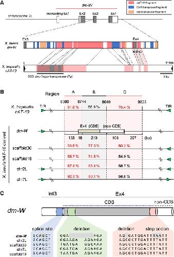 Neofunctionalization of a Noncoding Portion of a DNA Transposon in the Coding Region of the Chimerical Sex-Determining Gene dm-W in Xenopus Frogs. , Hayashi S, Suda K, Fujimura F, Fujikawa M, Tamura K , Tsukamoto D, Evans BJ , Takamatsu N, Ito M., Mol Biol Evol. July 2, 2022; 39 (7):