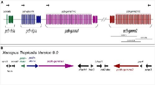 Characterization of a Single Genomic Locus Encoding the Clustered Protocadherin Receptor Diversity in Xenopus tropicalis. , Etlioglu HE, Sun W, Huang Z , Chen W, Schmucker D ., G3 (Bethesda). August 9, 2016; 6 (8): 2309-18.