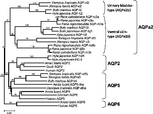 Immunocytochemical and phylogenetic analyses of an arginine vasotocin-dependent aquaporin, AQP-h2K, specifically expressed in the kidney of the tree frog, Hyla japonica. , Ogushi Y, Mochida H, Nakakura T, Suzuki M , Tanaka S., Endocrinology. December 1, 2007; 148 (12): 5891-901.