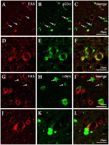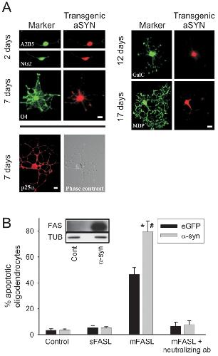 FAS-dependent cell death in α-synuclein transgenic oligodendrocyte models of multiple system atrophy., Kragh CL, Fillon G, Gysbers A, Hansen HD, Neumann M, Richter-Landsberg C, Haass C, Zalc B, Lubetzki C, Gai WP, Halliday GM, Kahle PJ, Jensen PH., PLoS One. January 1, 2013; 8 (1): e55243. |