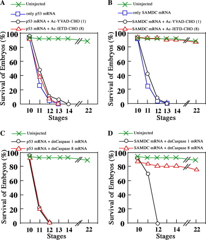 Occurrence of pre-MBT synthesis of caspase-8 mRNA and activation of caspase-8 prior to execution of SAMDC ( S-adenosylmethionine decarboxylase)-induced, but not p53-induced, apoptosis in Xenopus late blastulae. , Shiokawa K, Takayama E, Higo T, Kuroyanagi S, Kaito C, Hara H, Kajitani M, Sekimizu K, Tadakuma T, Miura K, Igarashi K, Yaoita Y ., Biochem Biophys Res Commun. October 21, 2005; 336 (2): 682-91.