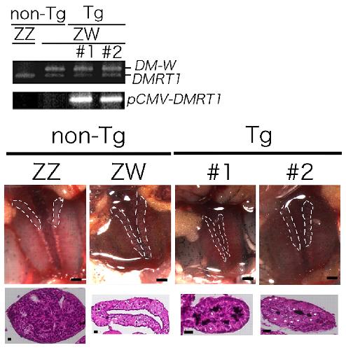 Opposite roles of DMRT1 and its W-linked paralogue, DM-W, in sexual dimorphism of Xenopus laevis: implications of a ZZ/ZW-type sex-determining system. , Yoshimoto S, Ikeda N, Izutsu Y , Shiba T, Takamatsu N, Ito M., Development. August 1, 2010; 137 (15): 2519-26.