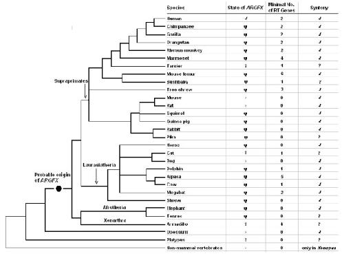 The origin and evolution of ARGFX homeobox loci in mammalian radiation. , Li G, Holland PW ., BMC Evol Biol. June 17, 2010; 10 182.