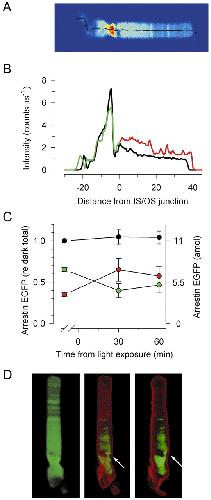 Quantification of the cytoplasmic spaces of living cells with EGFP reveals arrestin-EGFP to be in disequilibrium in dark adapted rod photoreceptors. , Peet JA, Bragin A, Calvert PD , Nikonov SS, Mani S, Zhao X, Besharse JC , Pierce EA, Knox BE , Pugh EN., J Cell Sci. June 15, 2004; 117 (Pt 14): 3049-59.