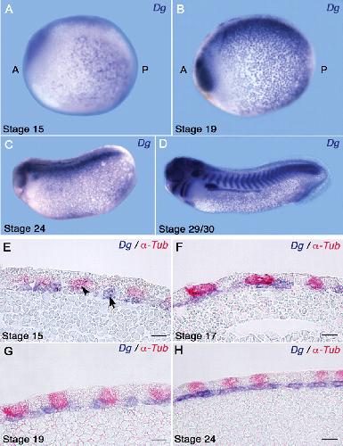 Cloning and expression patterns of dystroglycan during the early development of Xenopus laevis. , Moreau N, Alfandari D , Gaultier A , Cousin H , Darribère T ., Dev Genes Evol. July 1, 2003; 213 (7): 355-9.