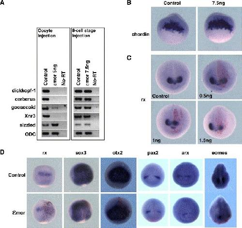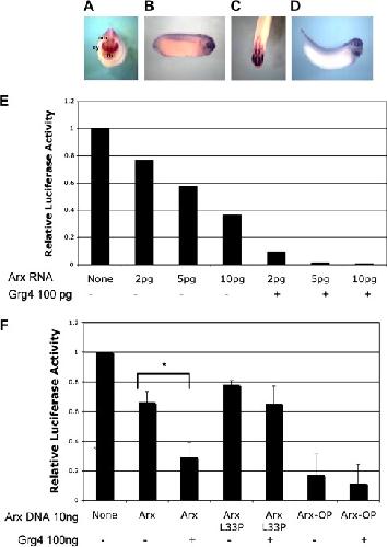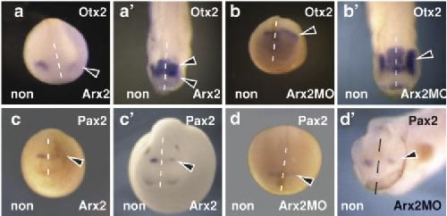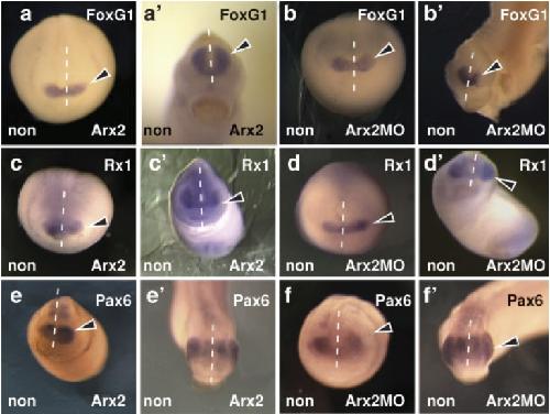Xenopus aristaless-related homeobox ( xARX) gene product functions as both a transcriptional activator and repressor in forebrain development. , Seufert DW , Prescott NL, El-Hodiri HM ., Dev Dyn. February 1, 2005; 232 (2): 313-24.
