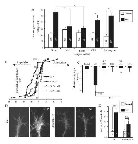 Asymmetrical beta-actin mRNA translation in growth cones mediates attractive turning to netrin-1., Leung KM, van Horck FP, Lin AC, Allison R, Standart N, Holt CE., Nat Neurosci. October 1, 2006; 9 (10): 1247-56. |