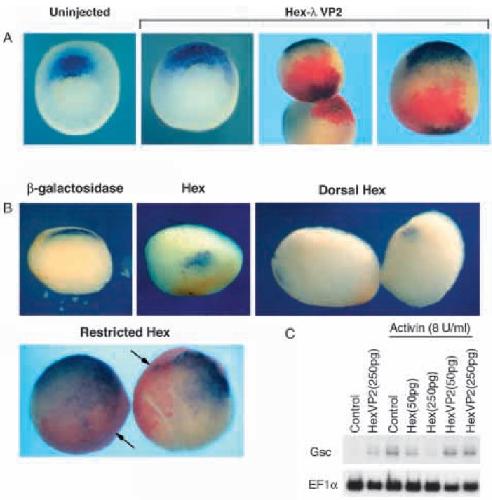 Hex is a transcriptional repressor that contributes to anterior identity and suppresses Spemann organiser function. , Brickman JM , Jones CM , Clements M, Smith JC , Beddington RS., Development. June 1, 2000; 127 (11): 2303-15.