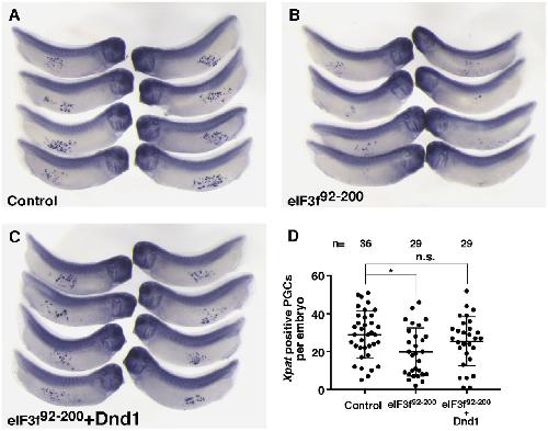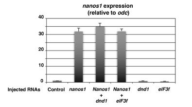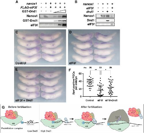 Maternal Dead-end 1 promotes translation of nanos1 by binding the eIF3 complex. , Aguero T , Jin Z, Chorghade S, Kalsotra A, King ML , Yang J ., Development. October 15, 2017; 144 (20): 3755-3765.