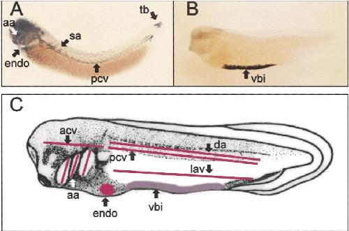 Elucidating the origins of the vascular system: a fate map of the vascular endothelial and red blood cell lineages in Xenopus laevis., Mills KR, Kruep D, Saha MS., Dev Biol. May 15, 1999; 209 (2): 352-68. |