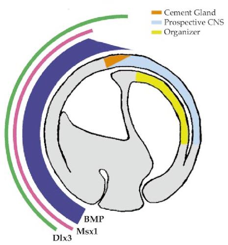 Inhibitory patterning of the anterior neural plate in Xenopus by homeodomain factors Dlx3 and Msx1. , Feledy JA, Beanan MJ, Sandoval JJ, Goodrich JS, Lim JH, Matsuo-Takasaki M, Sato SM , Sargent TD ., Dev Biol. August 15, 1999; 212 (2): 455-64.