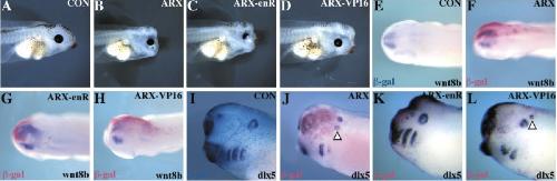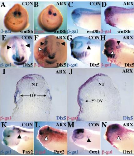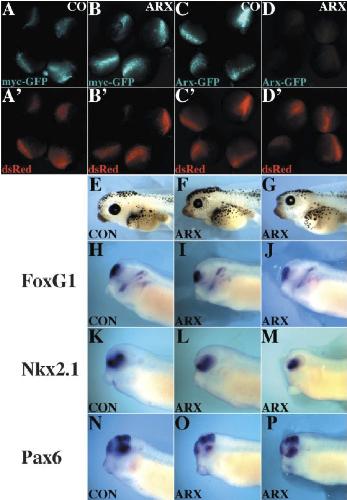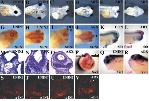 Xenopus aristaless-related homeobox ( xARX) gene product functions as both a transcriptional activator and repressor in forebrain development. , Seufert DW , Prescott NL, El-Hodiri HM ., Dev Dyn. February 1, 2005; 232 (2): 313-24.