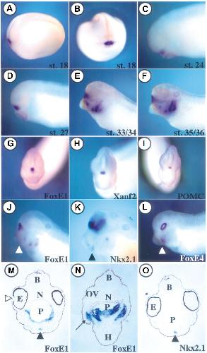 Xenopus laevis FoxE1 is primarily expressed in the developing pituitary and thyroid. , El-Hodiri HM , Seufert DW , Nekkalapudi S, Prescott NL, Kelly LE, Jamrich M ., Int J Dev Biol. January 1, 2005; 49 (7): 881-4.