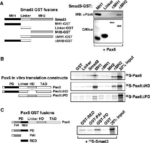 The MH1 domain of Smad3 interacts with Pax6 and represses autoregulation of the Pax6 P1 promoter., Grocott T, Frost V, Maillard M, Johansen T, Wheeler GN, Dawes LJ, Wormstone IM, Chantry A., Nucleic Acids Res. January 1, 2007; 35 (3): 890-901. |