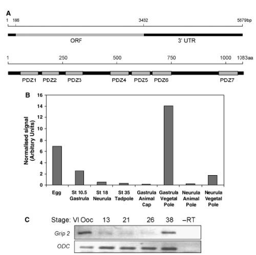 The efficiency of Xenopus primordial germ cell migration depends on the germplasm mRNA encoding the PDZ domain protein Grip2. , Kirilenko P, Weierud FK, Zorn AM , Woodland HR ., Differentiation. April 1, 2008; 76 (4): 392-403.