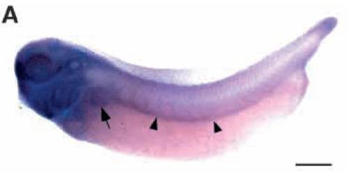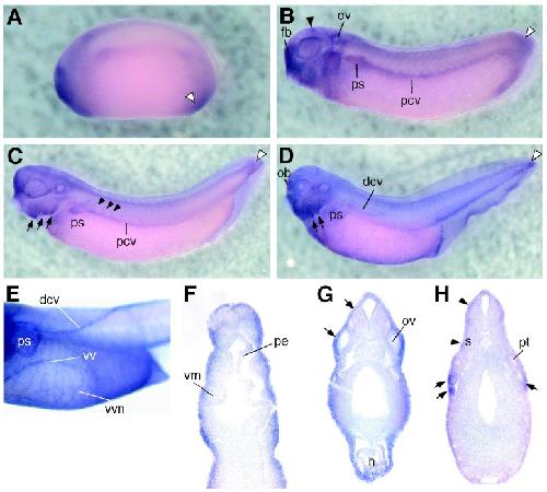 The receptor tyrosine kinase EphB4 and ephrin-B ligands restrict angiogenic growth of embryonic veins in Xenopus laevis. , Helbling PM, Saulnier DM, Brändli AW ., Development. January 1, 2000; 127 (2): 269-78.
