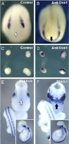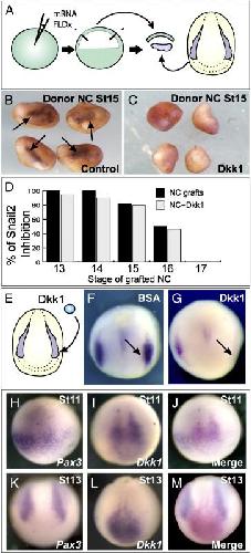 Neural crests are actively precluded from the anterior neural fold by a novel inhibitory mechanism dependent on Dickkopf1 secreted by the prechordal mesoderm. , Carmona-Fontaine C, Acuña G, Ellwanger K, Niehrs C , Mayor R ., Dev Biol. September 15, 2007; 309 (2): 208-21.