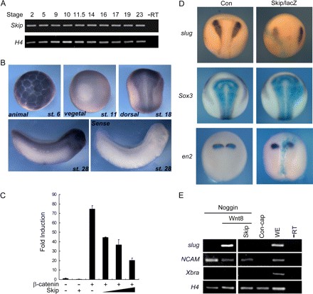 Xenopus skip modulates Wnt/beta-catenin signaling and functions in neural crest induction. , Wang Y, Fu Y, Gao L, Zhu G, Liang J, Gao C, Huang B, Fenger U, Niehrs C , Chen YG , Wu W., J Biol Chem. April 2, 2010; 285 (14): 10890-901.