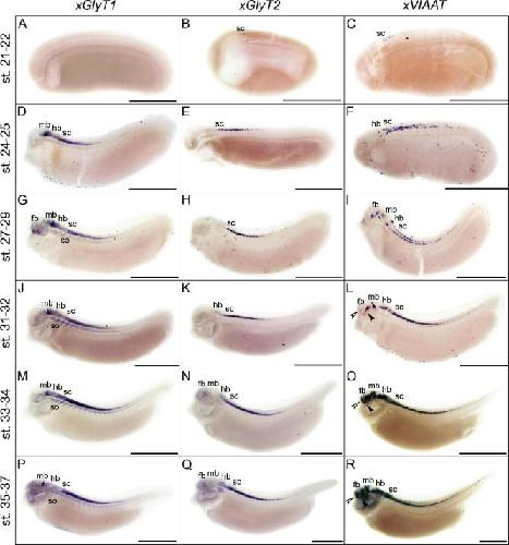 Expression patterns of glycine transporters ( xGlyT1, xGlyT2, and xVIAAT) in Xenopus laevis during early development. , Wester MR, Teasley DC, Byers SL, Saha MS ., Gene Expr Patterns. April 1, 2008; 8 (4): 261-70.