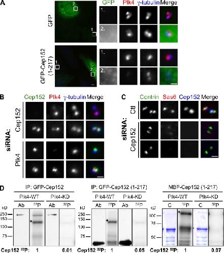 Cep152 interacts with Plk4 and is required for centriole duplication. , Hatch EM, Kulukian A, Holland AJ, Cleveland DW, Stearns T ., J Cell Biol. November 15, 2010; 191 (4): 721-9.