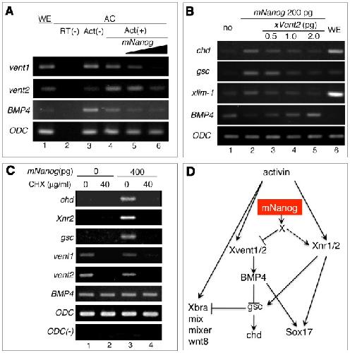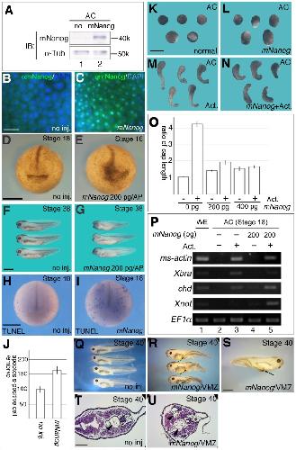 mNanog possesses dorsal mesoderm-inducing ability by modulating both BMP and Activin/ nodal signaling in Xenopus ectodermal cells. , Miyazaki A, Ishii K, Yamashita S, Nejigane S, Matsukawa S, Ito Y, Onuma Y , Asashima M , Michiue T ., PLoS One. January 1, 2012; 7 (10): e46630.