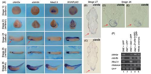 Claudin5 genes encoding tight junction proteins are required for Xenopus heart formation. , Yamagishi M , Ito Y, Ariizumi T, Komazaki S, Danno H, Michiue T , Asashima M ., Dev Growth Differ. September 1, 2010; 52 (7): 665-75.
