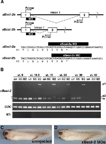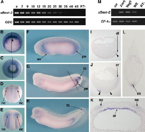 Bestrophin genes are expressed in Xenopus development. , Onuma Y , Haramoto Y, Nejigane S, Takahashi S , Asashima M ., Biochem Biophys Res Commun. July 3, 2009; 384 (3): 290-5.