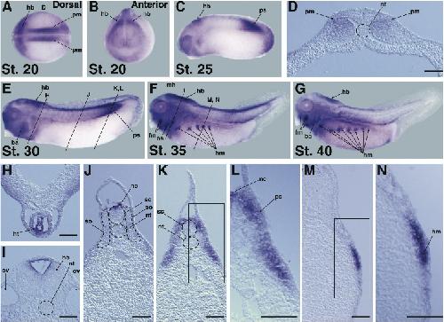 Physical interaction between Tbx6 and mespb is indispensable for the activation of bowline expression during Xenopus somitogenesis. , Hitachi K , Danno H, Kondow A , Ohnuma K, Uchiyama H, Ishiura S, Kurisaki A, Asashima M ., Biochem Biophys Res Commun. August 8, 2008; 372 (4): 607-12.