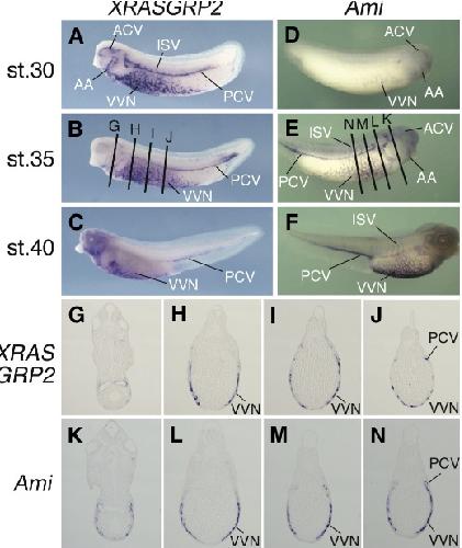 XRASGRP2 is essential for blood vessel formation during Xenopus development. , Suzuki K, Takahashi S , Haramoto Y, Onuma Y , Nagamine K, Okabayashi K, Hashizume K, Iwanaka T, Asashima M ., Int J Dev Biol. January 1, 2010; 54 (4): 609-15.