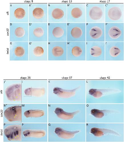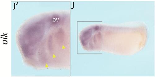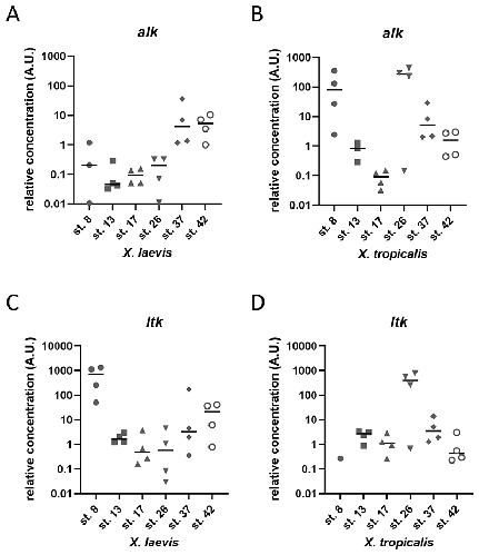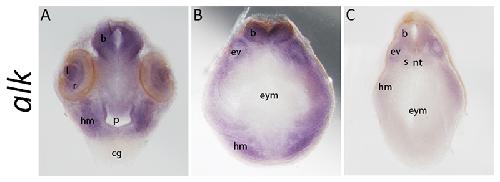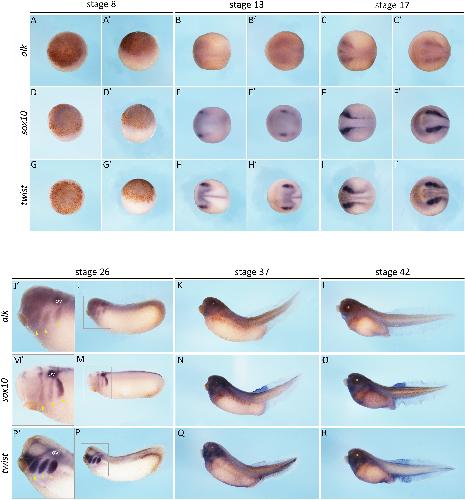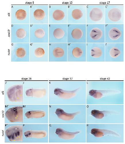 Anaplastic lymphoma kinase (alk), a neuroblastoma associated gene, is expressed in neural crest domains during embryonic development of Xenopus. , Moreno MM, Barrell WB, Godwin A , Guille M , Liu KJ ., Gene Expr Patterns. June 19, 2021; 40 119183.