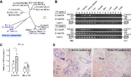 A novel missense mutation in the sodium bicarbonate cotransporter (NBCe1/SLC4A4) causes proximal tubular acidosis and glaucoma through ion transport defects., Dinour D, Chang MH, Satoh J, Smith BL, Angle N, Knecht A, Serban I, Holtzman EJ, Romero MF., J Biol Chem. December 10, 2004; 279 (50): 52238-46. |