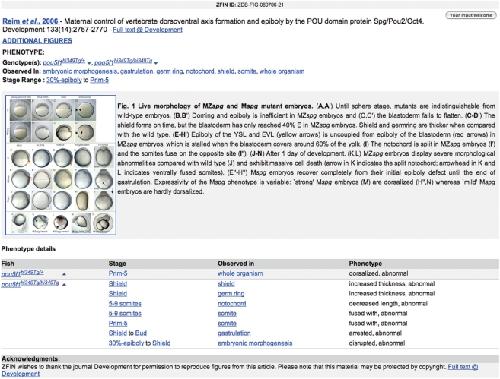 The Zebrafish Information Network: the zebrafish model organism database provides expanded support for genotypes and phenotypes., Sprague J, Bayraktaroglu L, Bradford Y, Conlin T, Dunn N, Fashena D, Frazer K, Haendel M, Howe DG, Knight J, Mani P, Moxon SA, Pich C, Ramachandran S, Schaper K, Segerdell E, Shao X, Singer A, Song P, Sprunger B, Van Slyke CE, Westerfield M., Nucleic Acids Res. January 1, 2008; 36 (Database issue): D768-72. |
